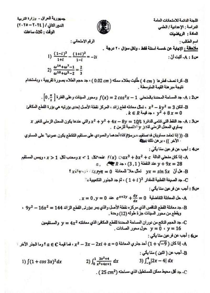 أسئلة مادة الرياضيات لطلبة السادس العلمي الدور الثاني 2025