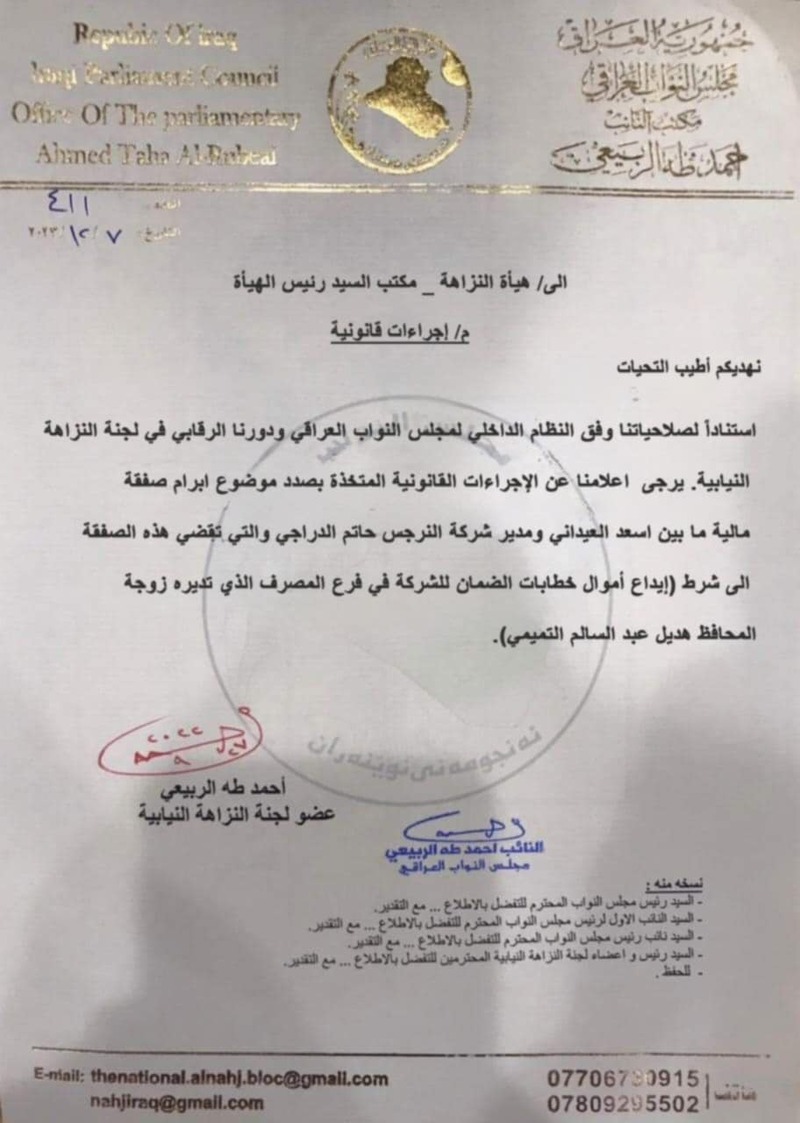 عضو لجنة النزاهة النائب احمد الربيعي يقدم استفسار الى لجنة النزاهة حول دعاوى فساد تخص محافظ البصرة اسعد العيداني