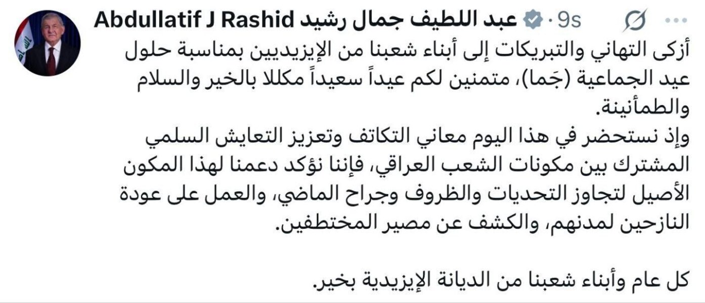 رئيس الجمهورية يهنئ الإيزيديين بمناسبة حلول عيد الجماعية (جَما)