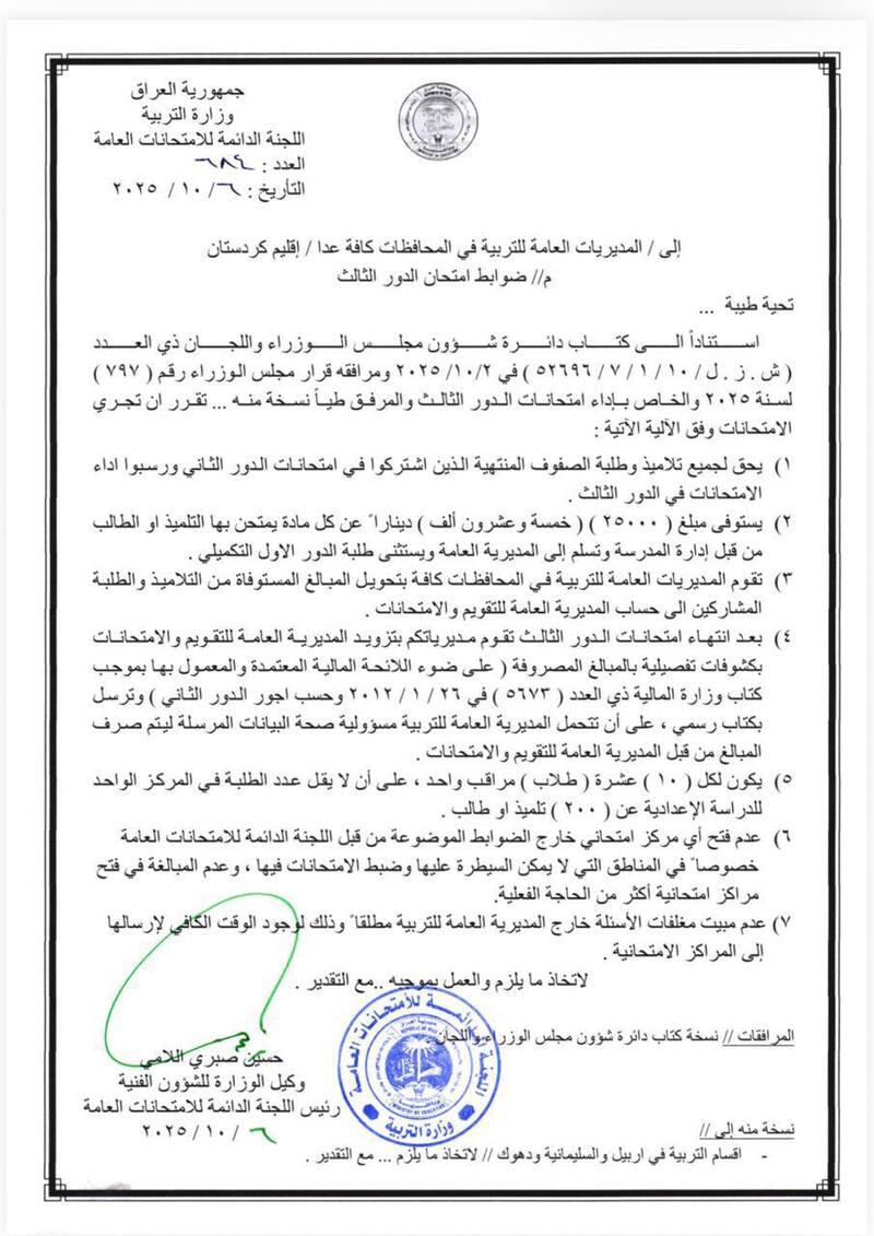 وزارة التربية/ اللجنة الدائمة للإمتحانات العامة تنشر ضوابط وآلية أداء آمتحانات الدور الثالث للمراحل الدراسية المنتهية/ لعام ٢٠٢٤_٢٠٢٥ على وفق ما ورد