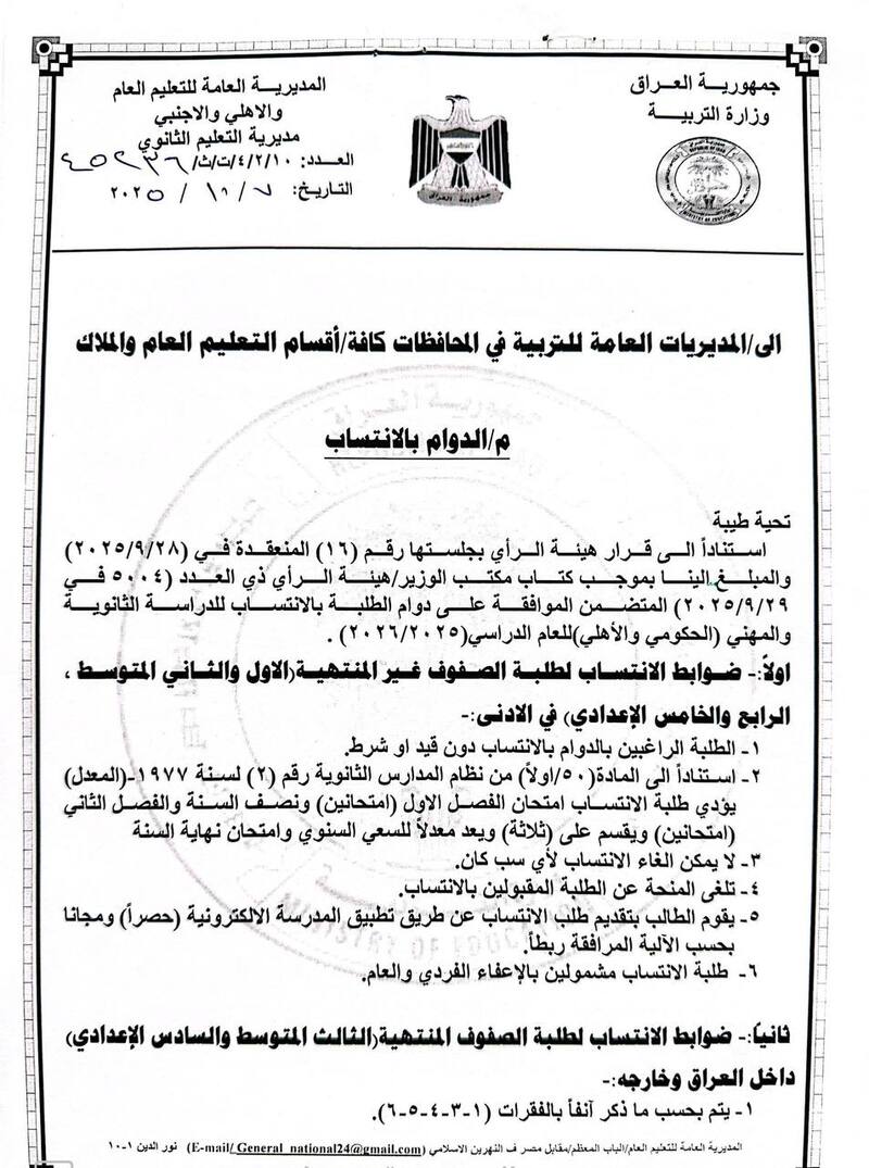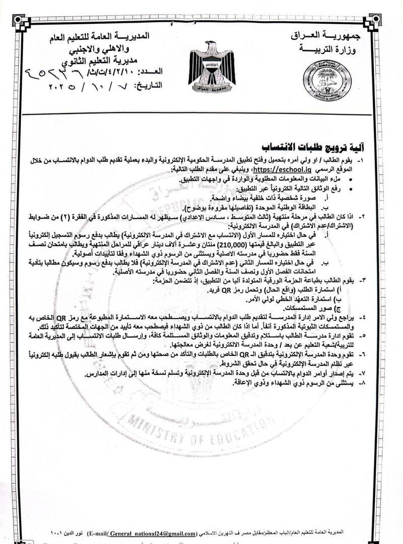 وزارة التربية تعلن ضوابط الانتساب لطلبة المراحل الثانوية وتحدد 2025/11/30 اخر موعد للتقديم.