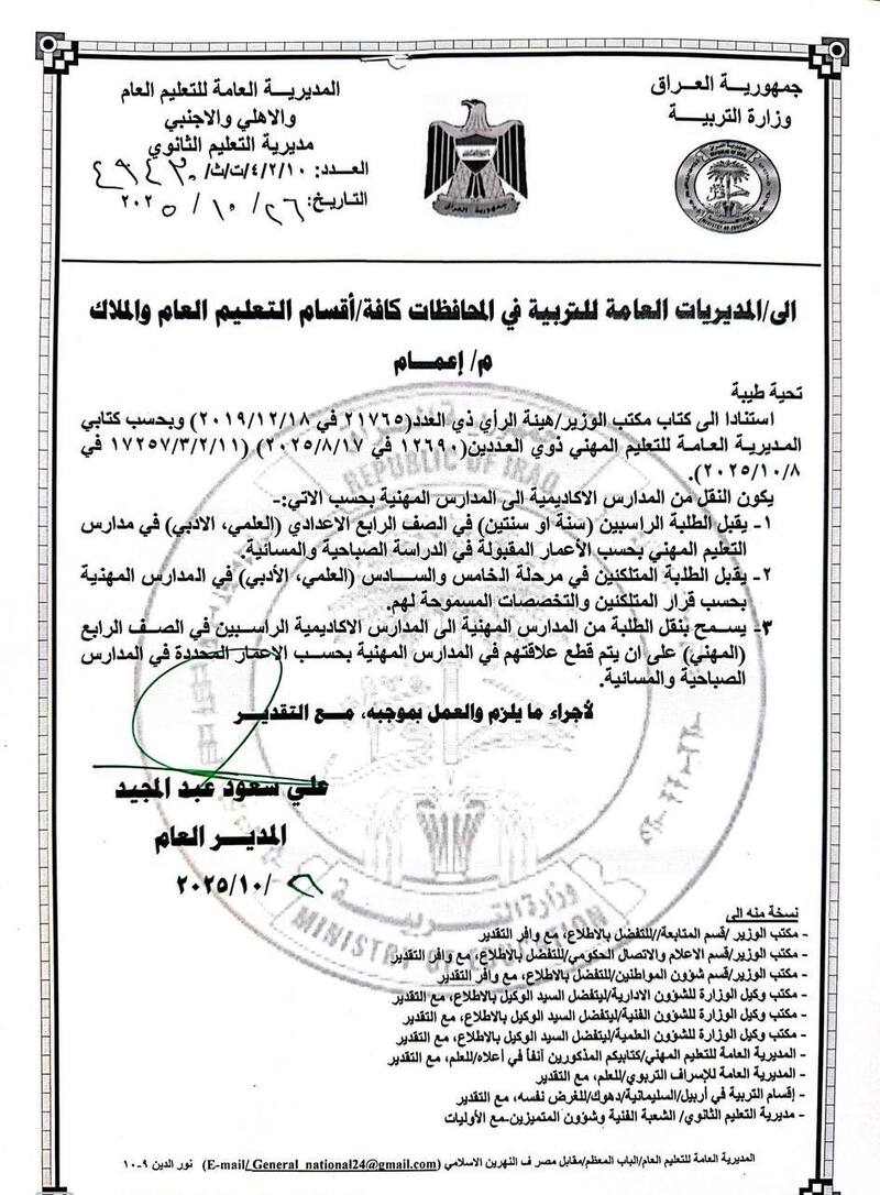 وزارة التربية/ المديرية العامة للتعليم العام والاهلي والاجنبي تُعلن ضوابط النقل من المدارس الأكاديمية الى المدارس المهنية وبالعكس للعام الدراسي ٢٠٢٥_٢٠٢٦وحسب ما موضح في الادنى: