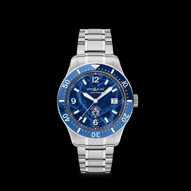 تقدّم مونت بلانك أول ساعة غوص رياضية لها مع Iced Sea Automatic Date، مزوّدة بميناء أزرق بنقش جليدي مستوحى من نهر مير دو جلاس الجليدي في جبال مونت بلانك، يوفّر إحساسًا بانعكاس أعماق المياه المتجمدة.