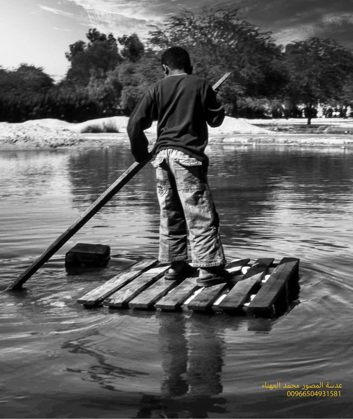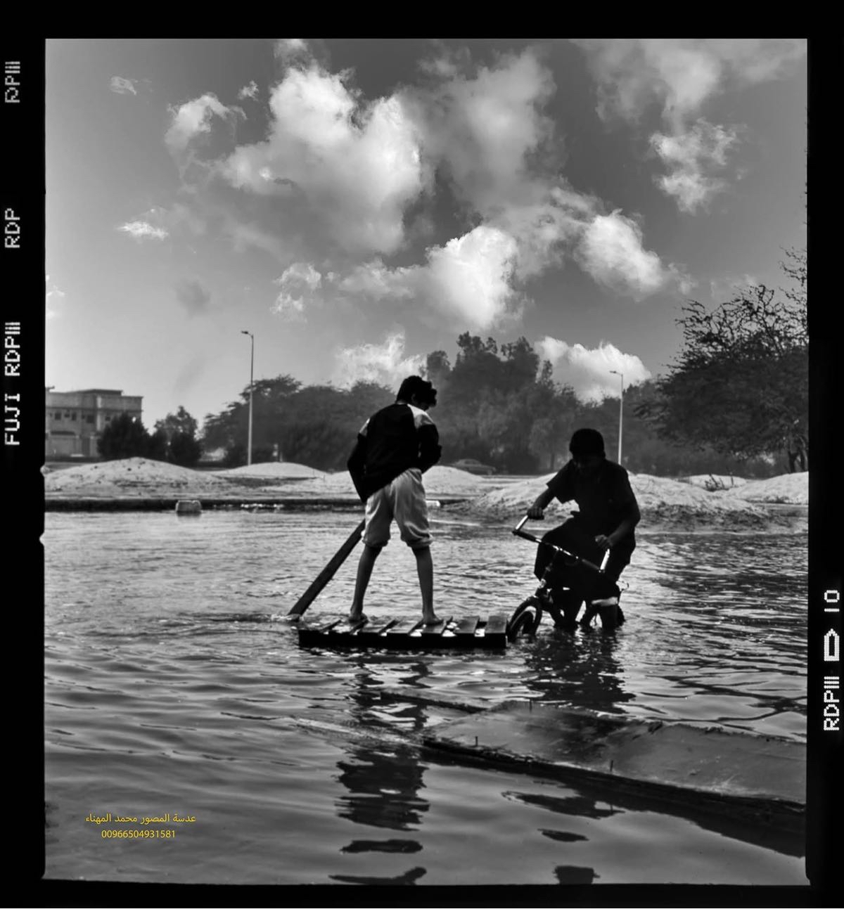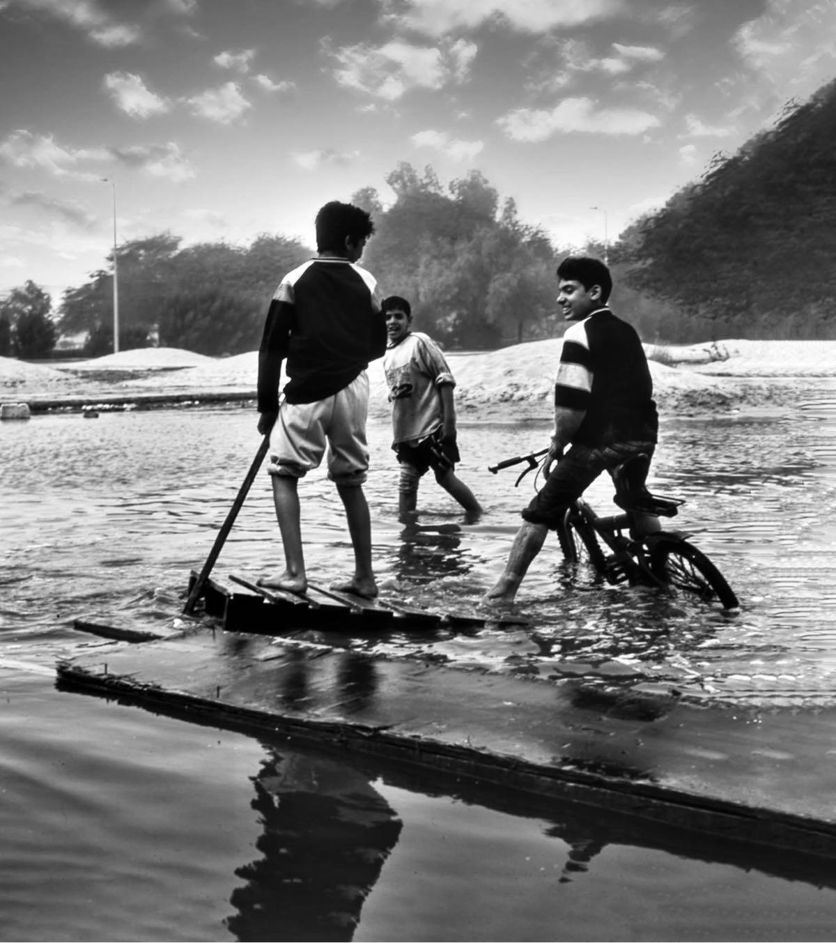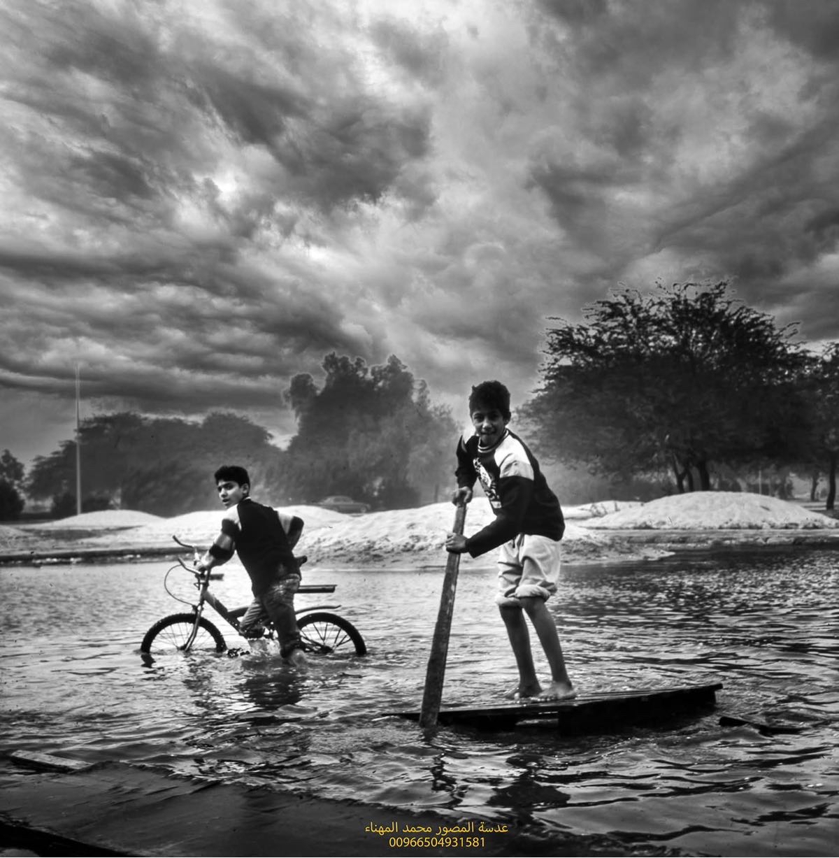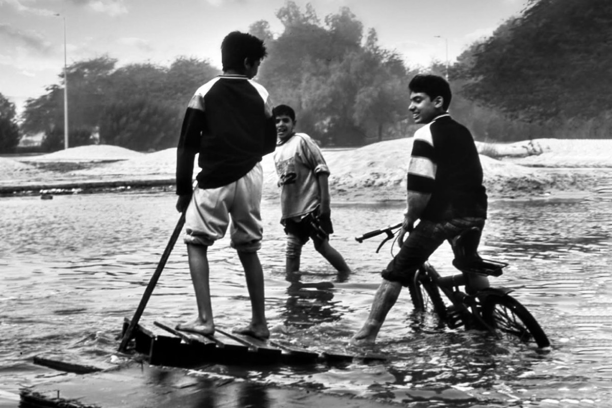 وقرر المصور البحث الدؤوب داخل الأحياء الشعبية لتوثيق ما وصفه بـ ”الكرنفال المطري“، ليعثر بعد ترقب على مجموعة صبية يلهون بسفينة خشبية وسط تجمعات المياه في مشهد عفوي.