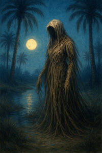 تصف الروايات القديمة “أمّ الخضر والليف” بأنها امرأة من نخيل, جسدها مؤلَّف من الخضر اليابس والليف المتدلّي، كأنها خُلقت من بقايا الأرض بعد أن نُزعت عنها الحياة. وجهها لا يُرى بوضوح، كأنّ الظلال تتواطأ على إخفائه. حين تمشي، تُصدر خشخشةً تشبه احتكاك الرياح بجريد النخل، وحين تتنفس، تشتمّ رائحة الماء الآسن والعيون المهجورة. يُقال إنها تظهر عند منتصف الليل في البساتين التي خلت من أصحابها، أو عند العيون التي فقدت ماءها، كأنها تعود لتبكي ما انقطع من حبلٍ بين الإنسان والنخلة، بين الواحة والنبع.