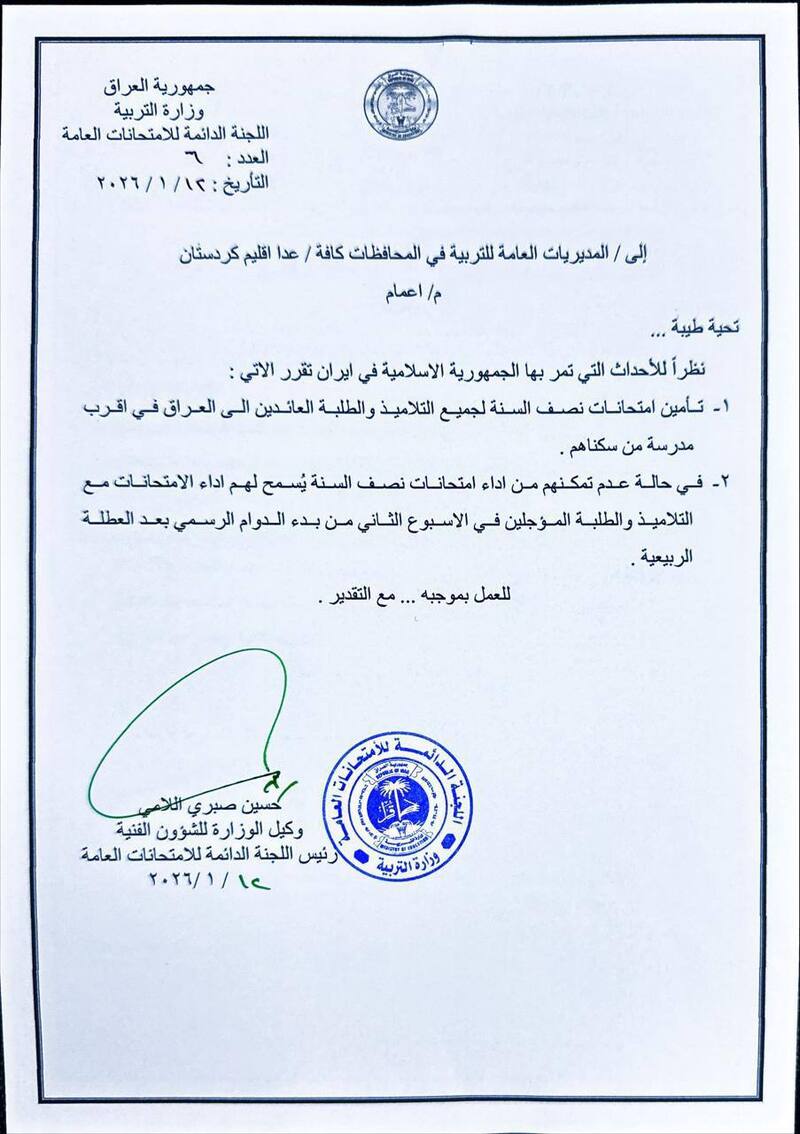 نظراً للأحداث الجارية، أصدرت وزارة التربية/ اللجنة الدائمة للامتحانات العامة توجيهاً عاجلاً يقضي بتأمين أداء امتحانات نصف السنة لجميع التلاميذ والطلبة العائدين إلى العراق من الجمهورية الإسلامية في إيران، وذلك في أقرب مدرسة إلى محل سكنهم.