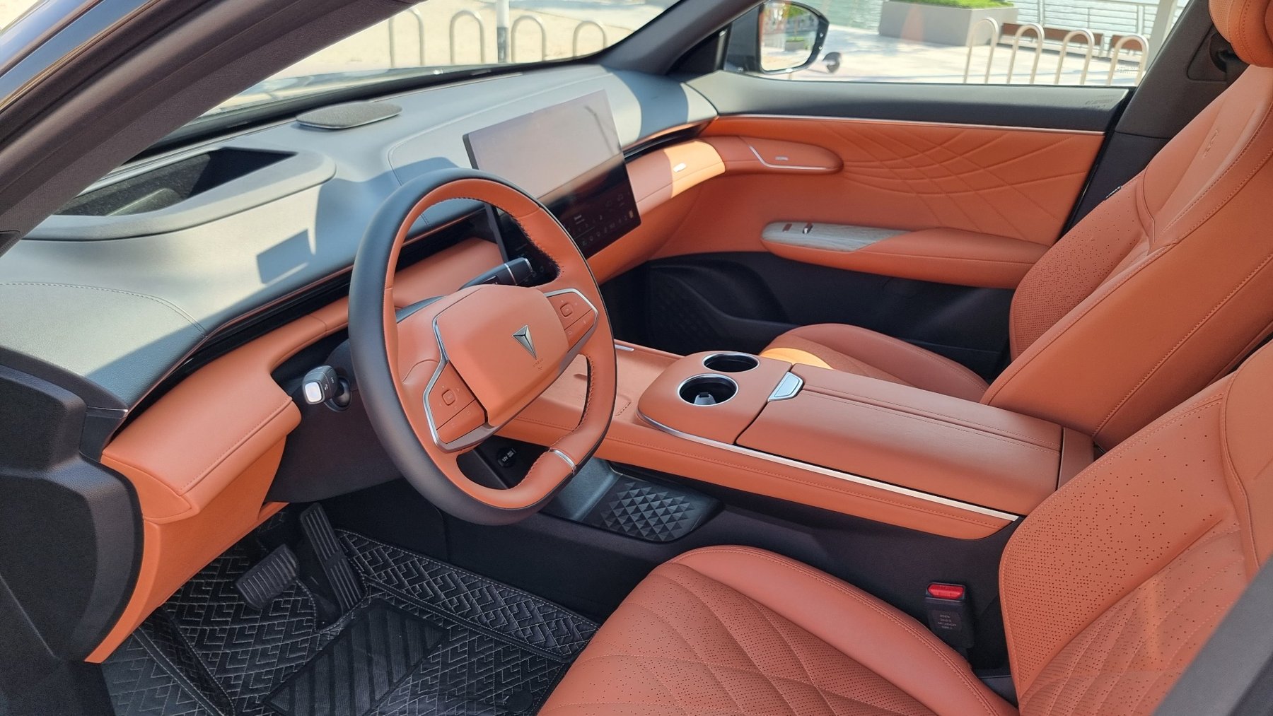 تعتمد المقصورة فلسفة التصميم البسيط الراقي، حيث تحيط لوحة القيادة بالسائق والركاب وتستخدم مواد عالية الجودة مع تفاصيل مستوحاة من تصميم اليخوت المتوسطية. وتبرز الشاشة المركزية الدوارة قياس 15.6 بوصة كعنصر أساسي في تجربة الاستخدام بفضل واجهة حديثة وسلسة.