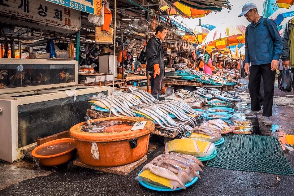 أحد أشهر الأسواق البحرية في كوريا، حيث يمكن رؤية الأسماك الطازجة وتجربة مأكولات محلية بشكل مباشر.