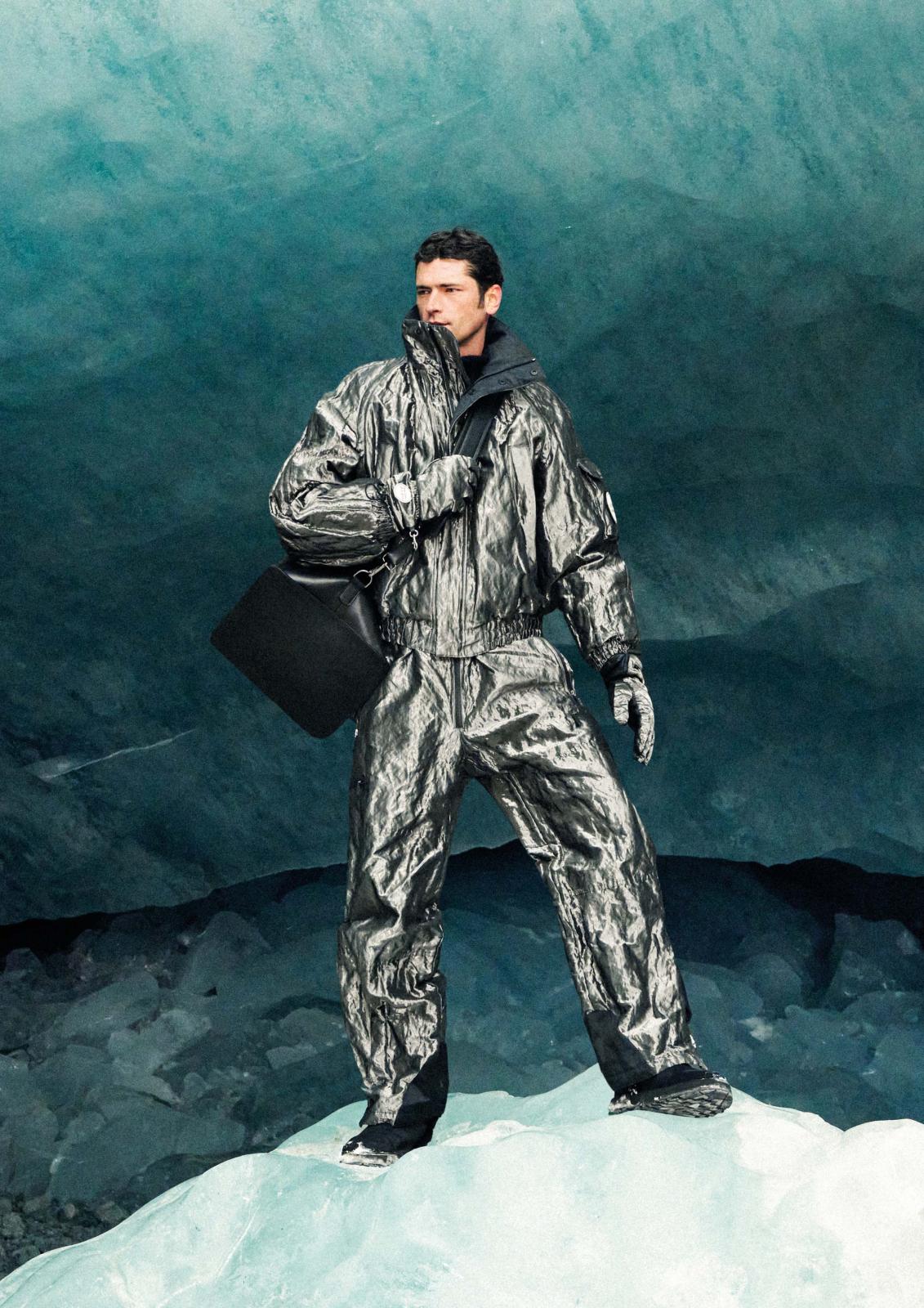 تضيء Giorgio Armani Neve من Giorgio Armani على إطلالة أحاديّة يغزوها قماش باللون المعدنيّ اللامع يكشف بقوّته عن تفاصيل سترة وسروال محبوكين بدقّة ومهارة - المصدر: Lukas Wassmann