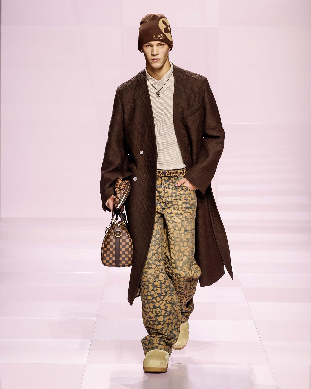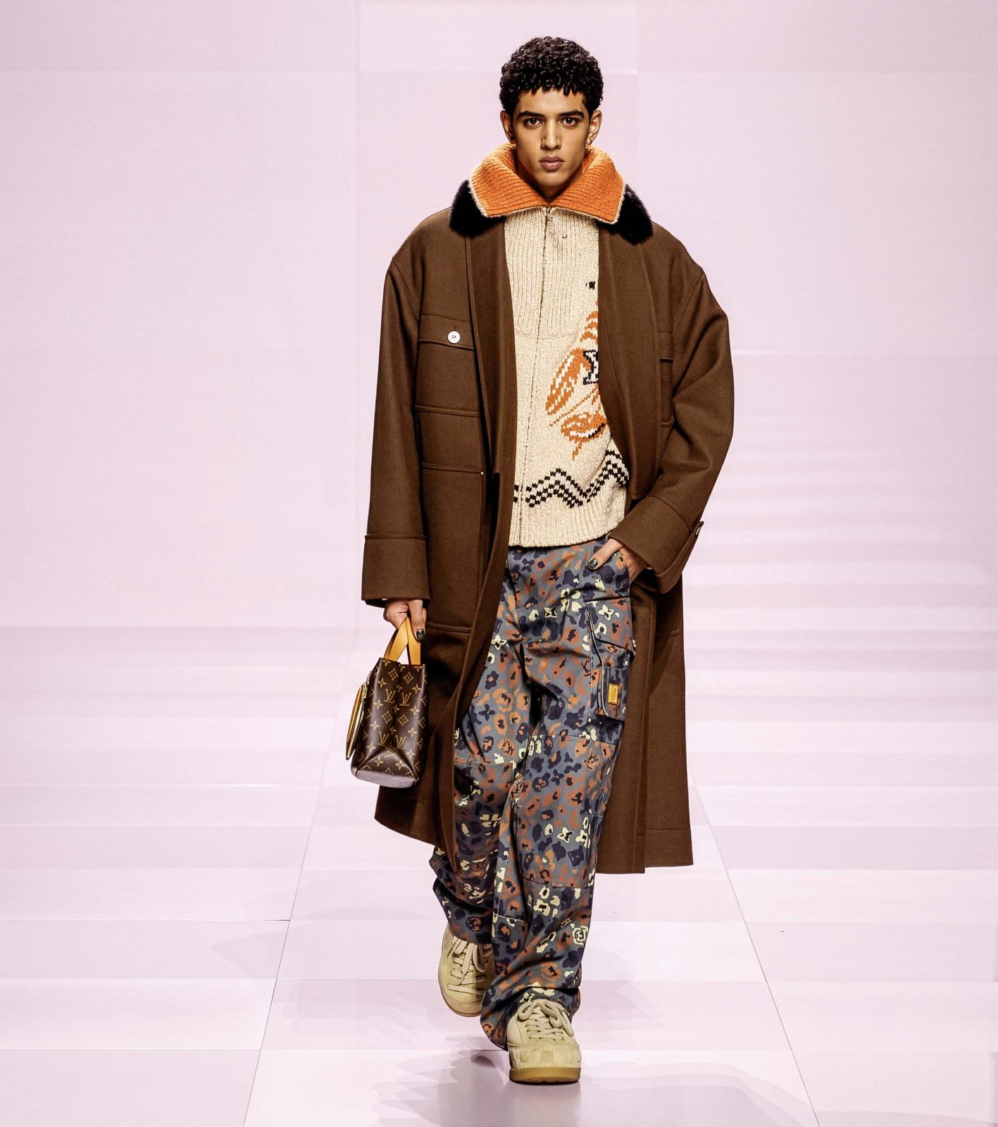 السروال المزخرف عنصر بارز في هذا الشتاء، وهو يعكس لمسة من الابتكار الاستثنائيّ، الذي تضيء عليه علامة Louis Vuitton، ويتناغم مع معطف طويل أحاديّ اللون متألّق بقصّته المدروسة - المصدر: Louis Vuitton