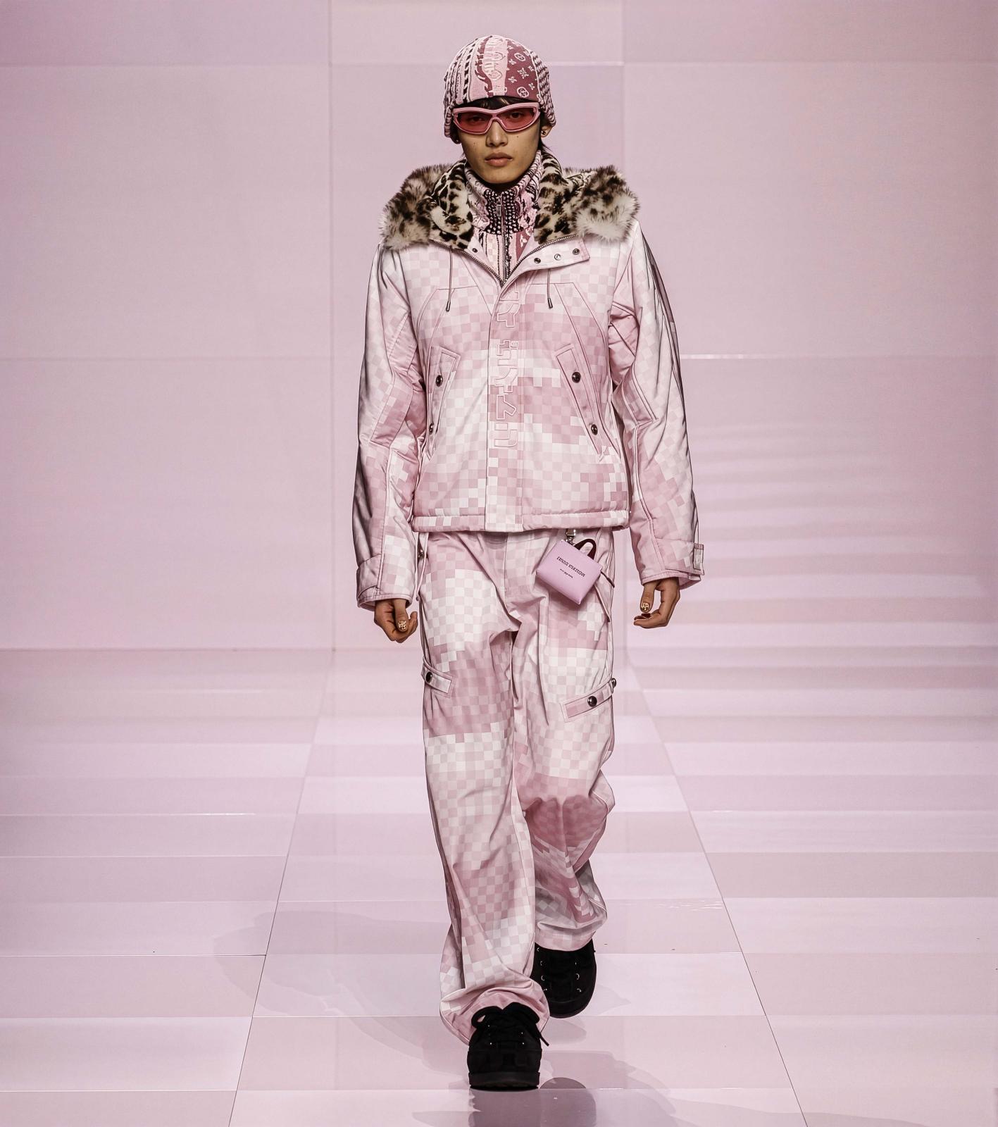 لمن يبحث عن التفرّد، يصب اللون الزهريّ في قائمة أفضل خيارات الرجل في هذا الشتاء. وبأسلوب Louis Vuitton، تبرز هذه الإطلالة الأحادية، التي تدمج بين قبّعة مبتكرة ونظّارات جاذبة وطقم عصريّ مثاليّ - المصدر: Louis Vuitton