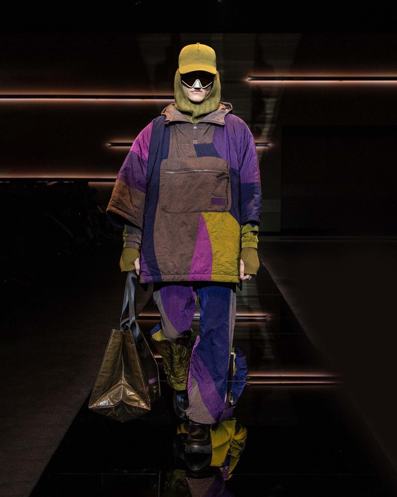 سحر الشتاء ينعكس في تفاصيل هذه الإطلالة من Emporio Armani، التي يتصدرها قميص مبتكر مزوّد بحقيبة مستطيلة ويتميّز بقماشه المتعدّد الألوان. وتكتمل أناقة هذه الإطلالة مع قفازات مفتوحة عند الأصابع وحقيبة يد فاخرة استثنائيّة بحجمها الكبير - المصدر: Emporio Armani