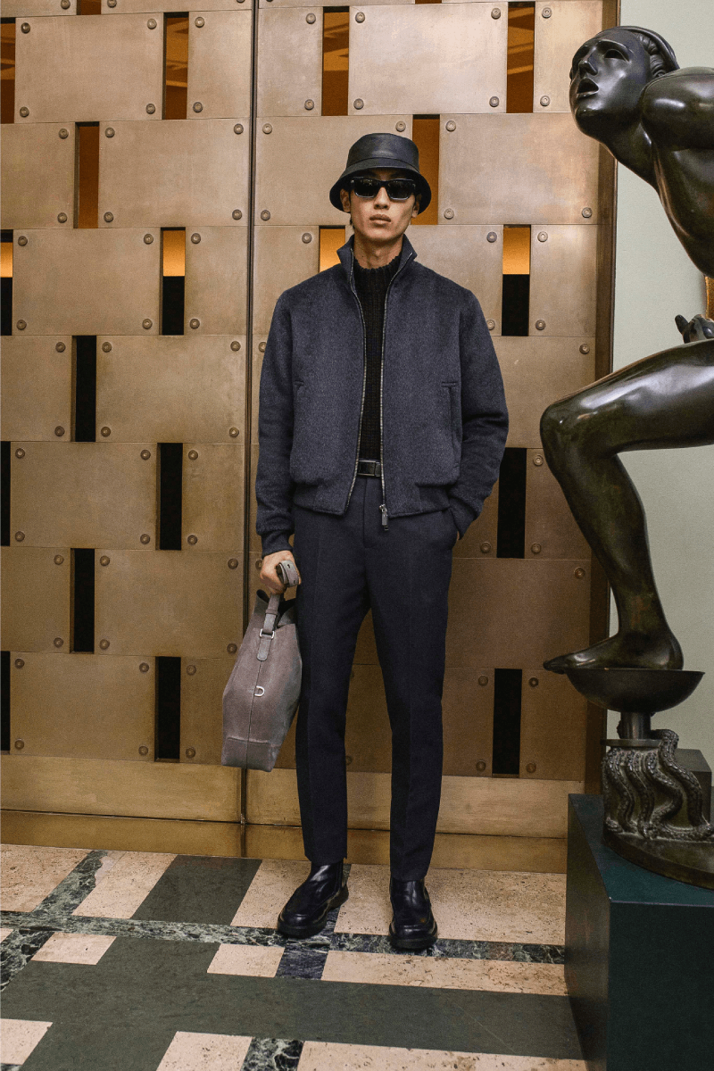 تقدّم Tod’s إطلالة متوازنة تجمع بين سترة هادئة مزوّدة بسحّاب وسروال بخطوط انسيابيّة، فيما تضفي القبعة الجلديّة الجاذبة والنظّارات الداكنة والحقيبة الرماديّة لمسة من الفرادة العصريّة - المصدر: Tod’s