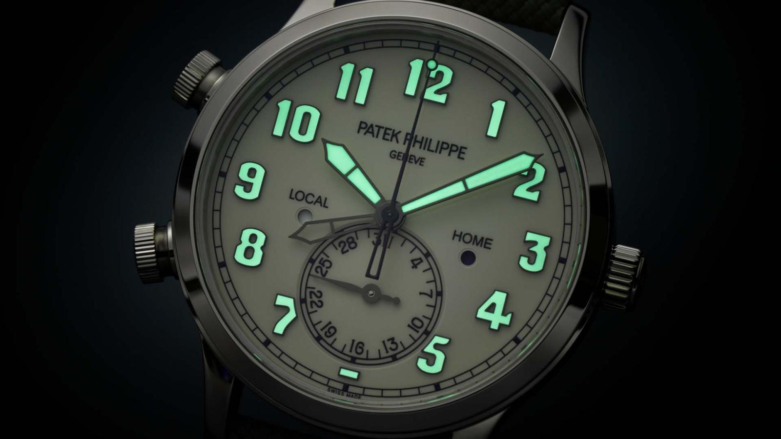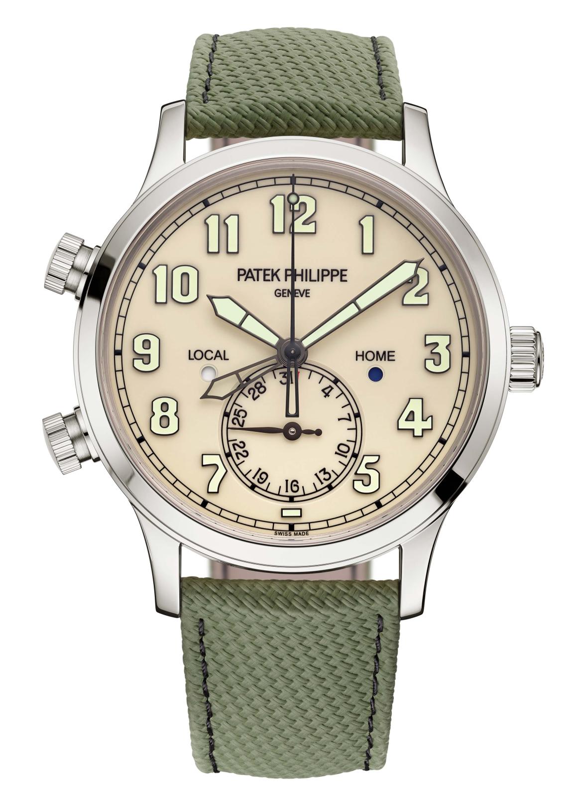 أعادت Patek Philippe تقديم رؤية جديدة في ساعة Calatrava Pilot Travel Time 5524G-010. ورغم أنها مستلهمة من عالم الطيران، إلا أنها تحاكي عظمة القمم بقوة أدائها، وهي تقوم على علبة مقاومة للماء حتى عمق 30 مترًا نفذتها العلامة بالذهب الأبيض بقطر 42 مم، وبغطاء خلفي من كريستال السفير. زودت العلامة هذه النسخة الجديدة بميناء أنيق مطلي باللون العاجي على الطراز القديم، وهي مزينة بأرقام محددة باللون الأسود. وفي قلب هذه الساعة الأنيقة والجريئة، ينبض عيار 26-330 S C FUS، وهو حركة ذاتية التعبئة تتميز بنظام سهل الاستخدام لعرض وقت السفر والكشف عن منطقتين زمنيتين مع مؤشري الليل والنهار للتوقيت المحلي والوطني، وتاريخ مرتبط بالتوقيت المحلي وثوانٍ مركزية متواصلة. وتكتمل هذه الساعة الأنيقة، المزودة باحتياطي الطاقة يراوح بين 35 ساعة كحد أدنى و45 ساعة كحد أقصى، بسوار باللون الأخضر الكاكي مرفق بإبزيم من الذهب الأبيض.