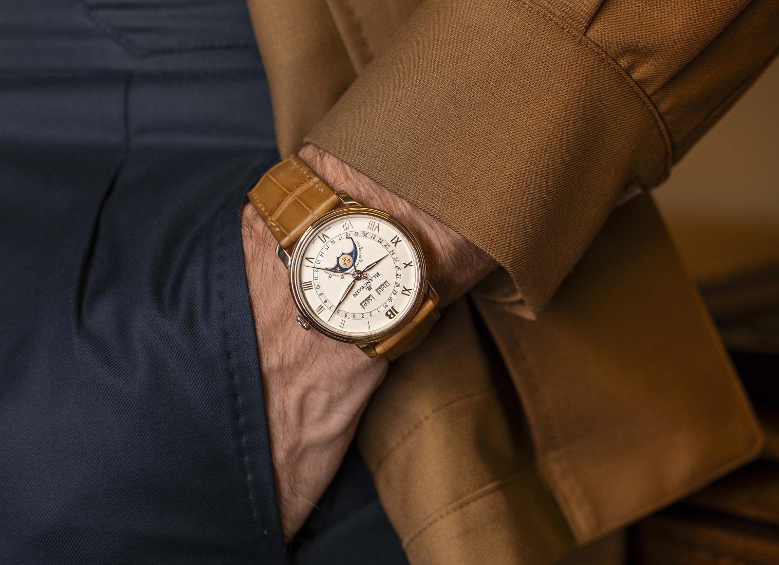 في قلب الطبيعة، يتعطش الرجل إلى ساعات تحتضن مؤشر أطوار القمر وتعرض اليوم والتاريخ والشهر، وساعات Blancpain تترجم هذه الرؤية وتشتهر بالساعات ذات التقويم الكامل التي تدمج بين الأداء العملي واللمسة الجمالية والجاذبية الفنية. وعلى وقع السياق الإبداعي فائق التصور، الذي يتطلع إليه هذا الرجل، فإنه يختار ساعة Quantième Complet من مجموعة Villeret، التي تصب فيها هذه الخصائص الدقيقة، وتستمد دقتها من عيار 6654.4 الأوتوماتيكي وتتمتع باحتياطي طاقة يصل إلى معدل 72 ساعة. تأتي هذه الساعة الفاخرة بعلبة مصوغة بالذهب الأحمر بقطر 40.20 مم، وهي مقاومة للماء حتى عمق 3 بارات، ويزدان ميناؤها بلون الأوبالين الراقي. أما تصميمها فيندمج مع سوار منسوج بجلد التمساح الفاخر يلتقي مع إبزيم قابل للطي يمنح راحة وأناقة عند الارتداء.
