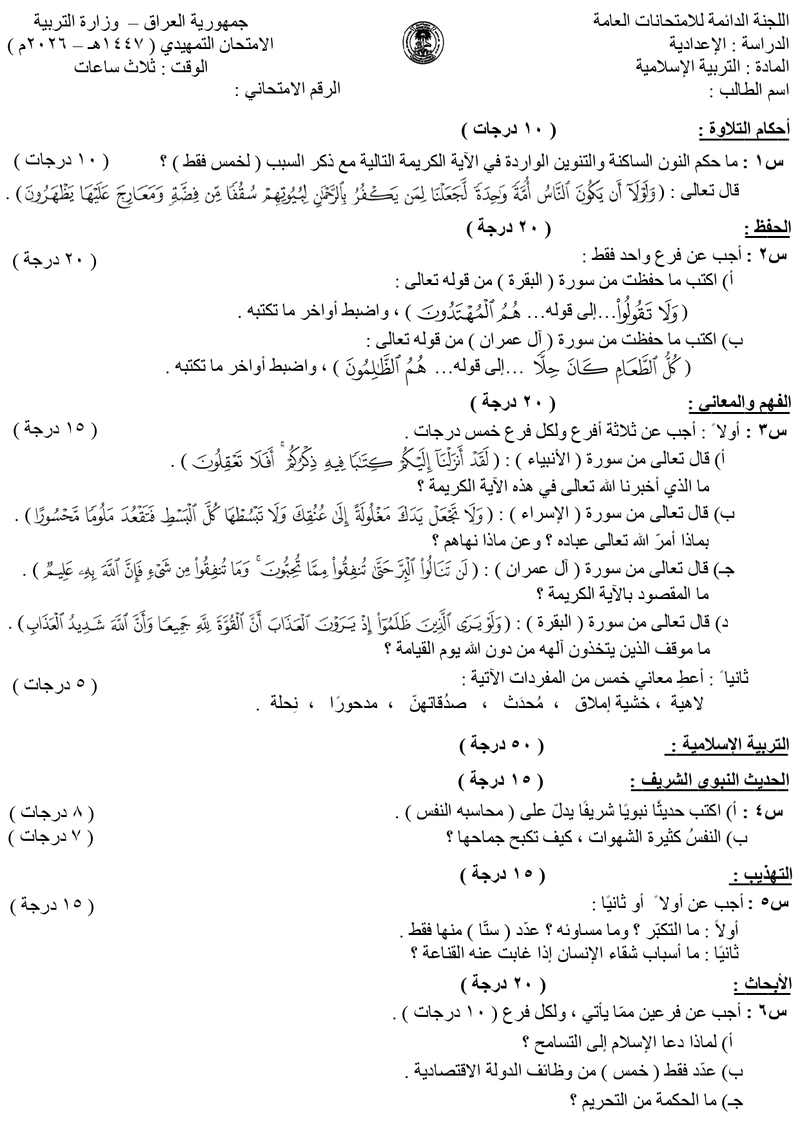 الأسئلة التمهيدية - مادة التربية الإسلامية - للصف السادس العلمي والأدبي - تمهيدي 2026