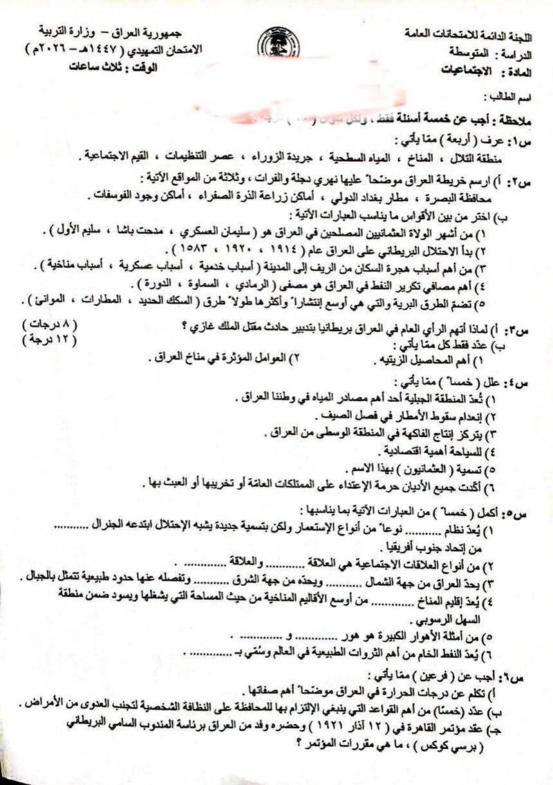 الأسئلة التمهيدية (الخارجية) - مادة الإجتماعيات - للصف الثالث المتوسط - تمهيدي 2026