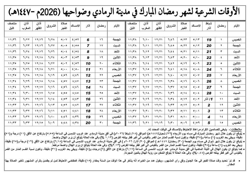 إمساكية شهر رمضان [ 2026 م - 1447 هـ ] لمدينة الرمادي وضواحيها