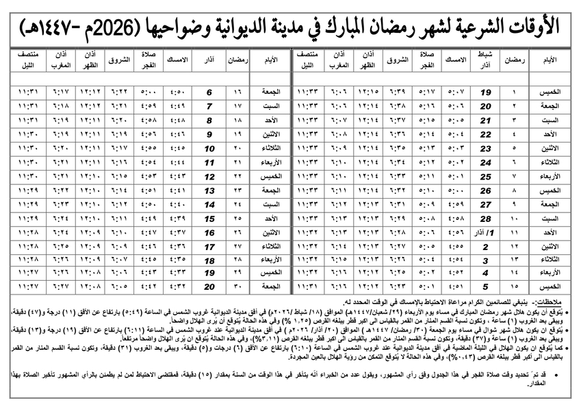 إمساكية شهر رمضان [ 2026 م - 1447 هـ ] لمدينة الديوانية وضواحيها
