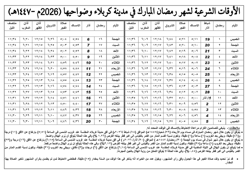 إمساكية شهر رمضان [ 2026 م - 1447 هـ ] لمدينة كربلاء المقدسة وضواحيها