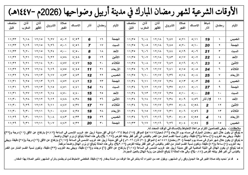 إمساكية شهر رمضان [ 2026 م - 1447 هـ ] لمدينة أربيل وضواحيها