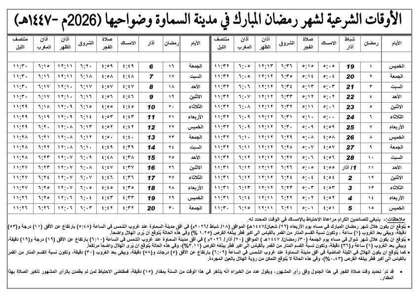 إمساكية شهر رمضان [ 2026 م - 1447 هـ ] لمدينة السماوة وضواحيها