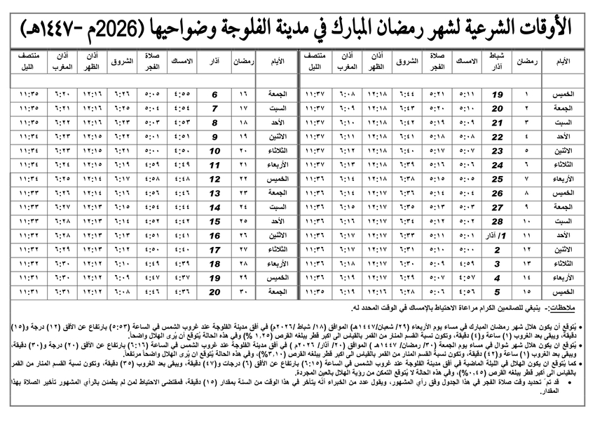 إمساكية شهر رمضان [ 2026 م - 1447 هـ ] لمدينة الفلوجة وضواحيها