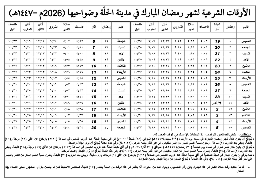 إمساكية شهر رمضان [ 2026 م - 1447 هـ ] لمدينة الحلّة وضواحيها