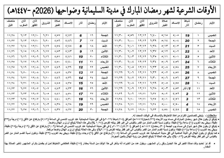 إمساكية شهر رمضان [ 2026 م - 1447 هـ ] لمدينة السليمانية وضواحيها