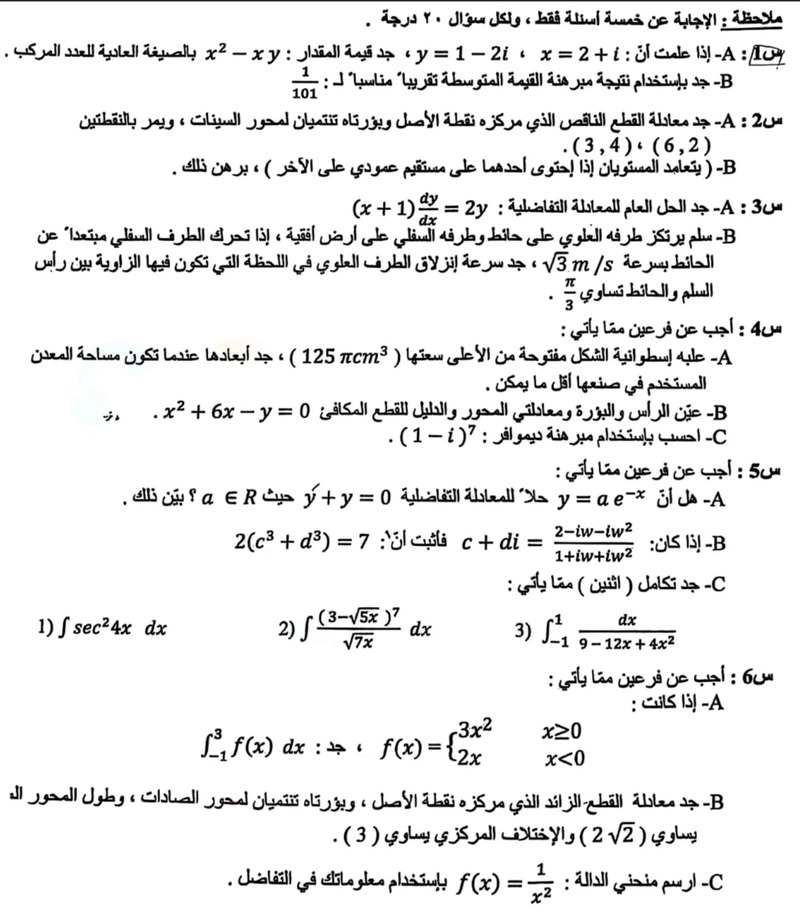 الأسئلة التمهيدية (الخارجية) - مادة الرياضيات - للصف السادس العلمي - تمهيدي 2026