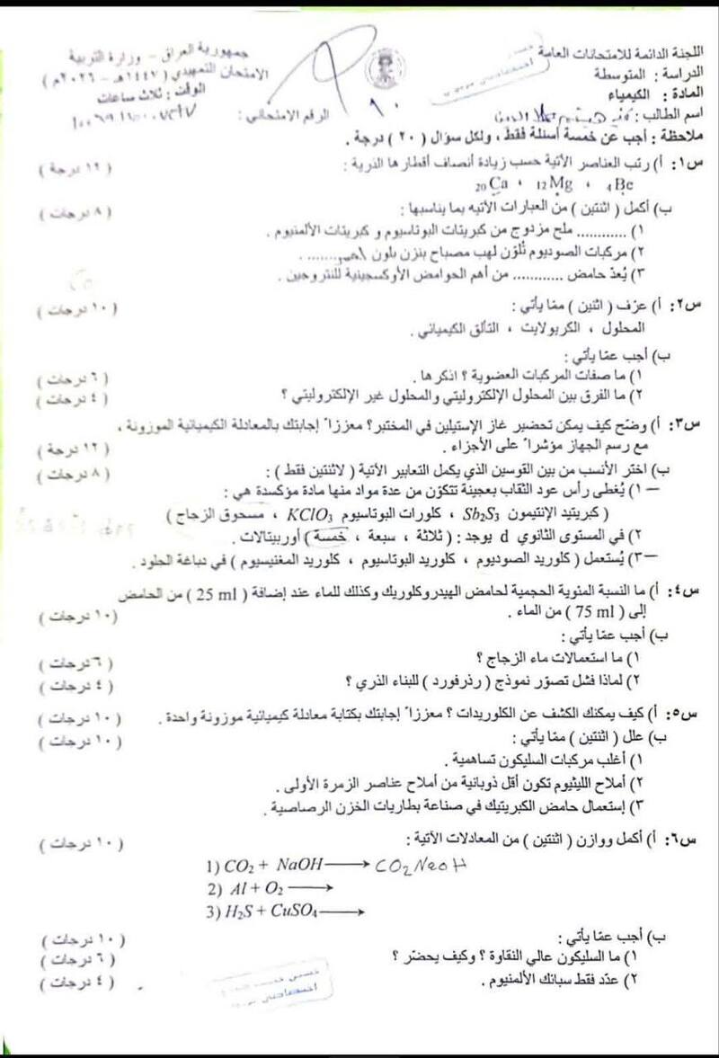 الأسئلة التمهيدية (الخارجية) - مادة الكيمياء - للصف الثالث المتوسط - تمهيدي 2026