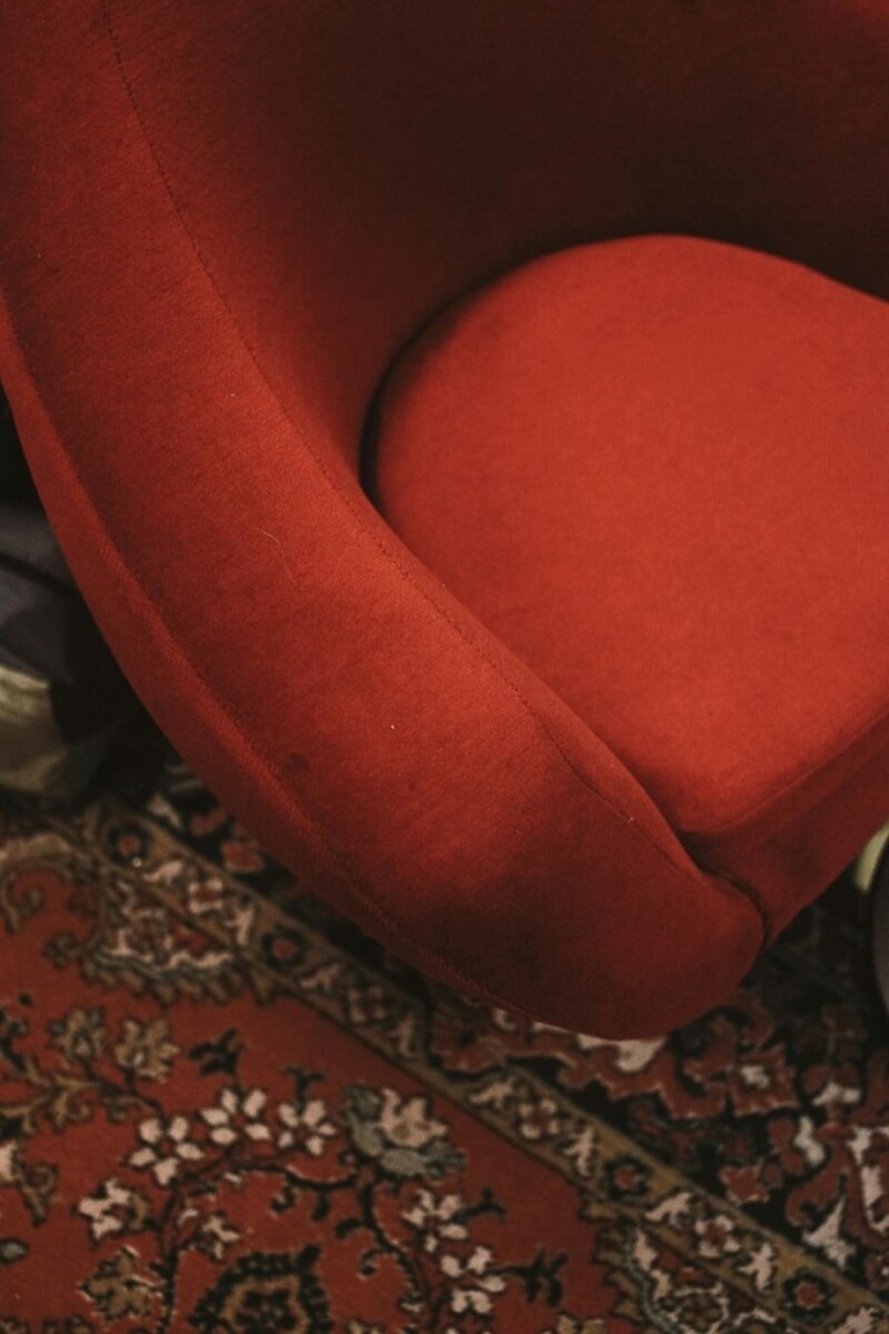 ما هو لون أحمر دم الغزال؟لقطة قريبة لكنب صغير جانبي مخملي بلون أحمر دم الغزال فوق سجادة منقوشة كلاسيكية