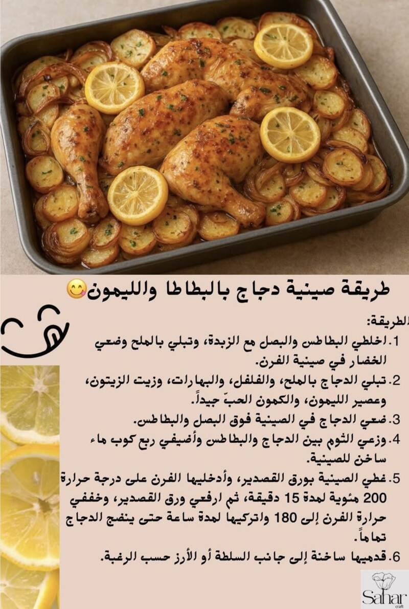 لصينية البطاطا بالدجاج والليمون: قطّعي البطاطا بحجمٍ متساوٍ لتَنضج بشكلٍ متوازن، وأضيفي عصير الليمون في الدقائق الأخيرة ليبقى الطعم منعشًا.