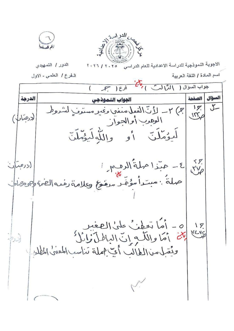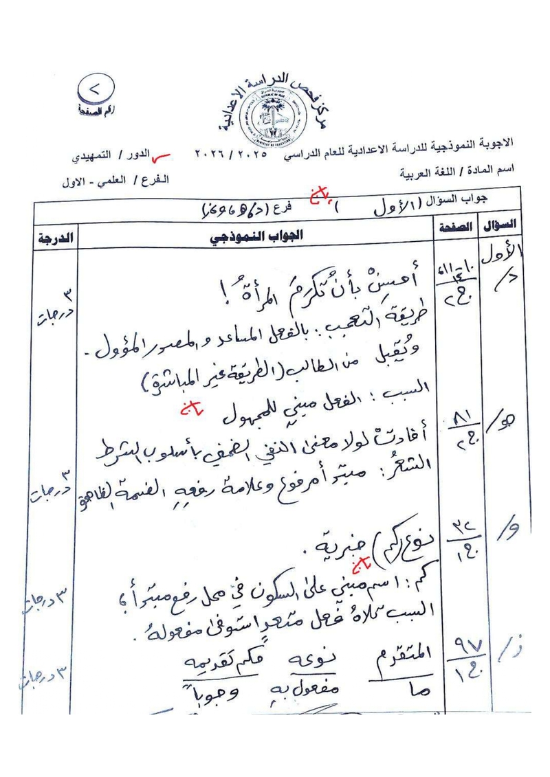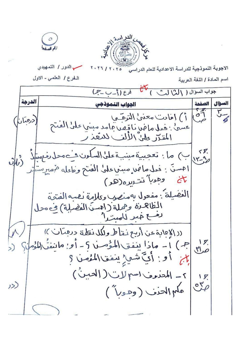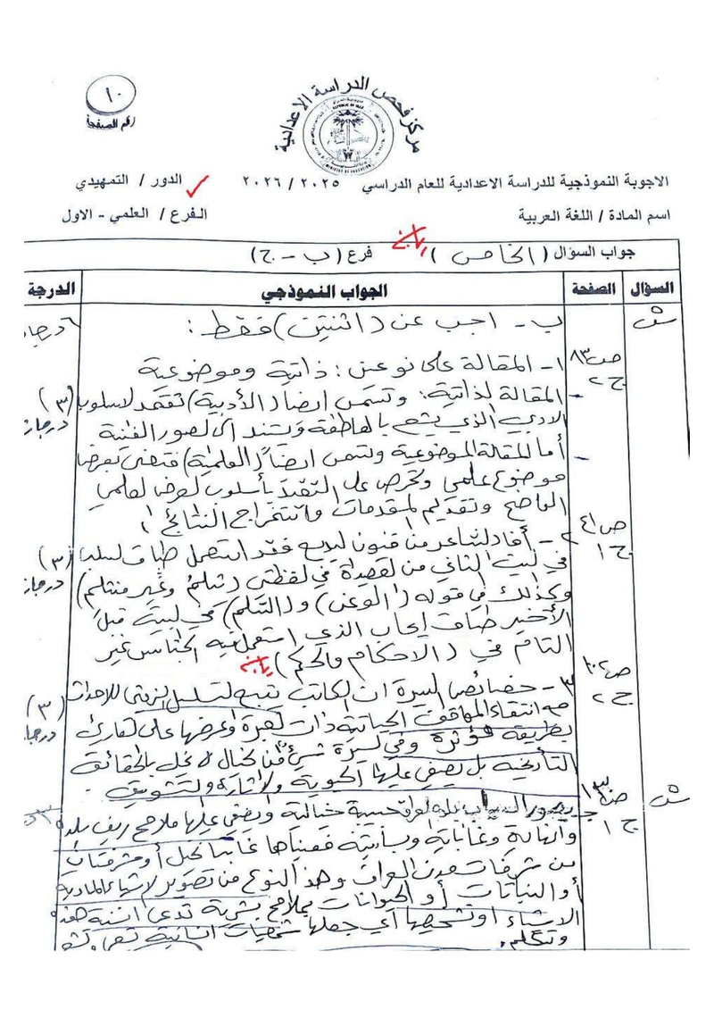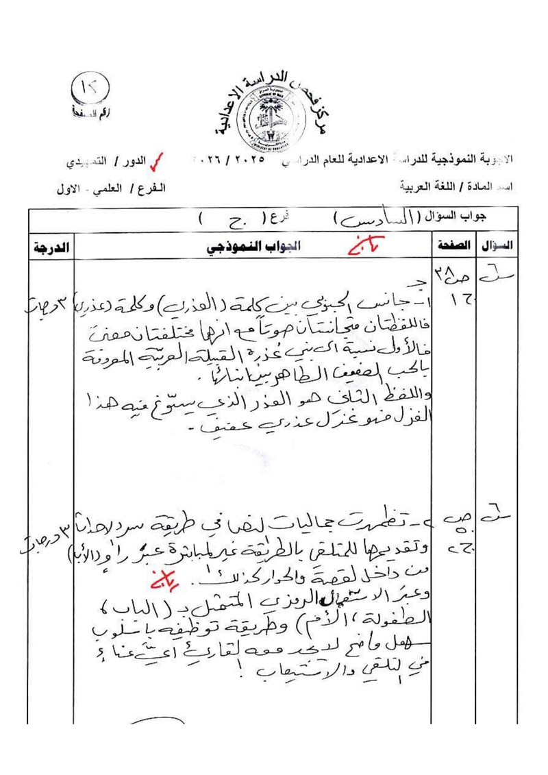 الأجوبة النموذجية لمادة اللغة العربية