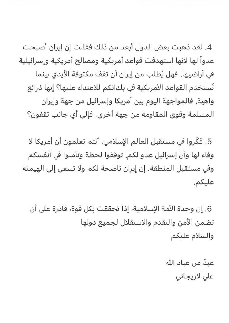 أمين المجلس الأعلى للأمن القومي الايراني علي لاريجاني يوجه رسالة إلى المسلمين في أنحاء العالم وإلى حكومات الدول الإسلامية: