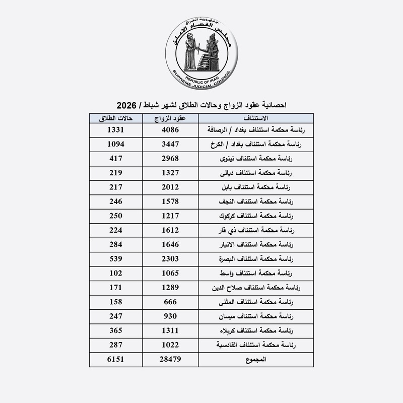 احصائية الزواج والطلاق لشهر شباط لسنة 2026