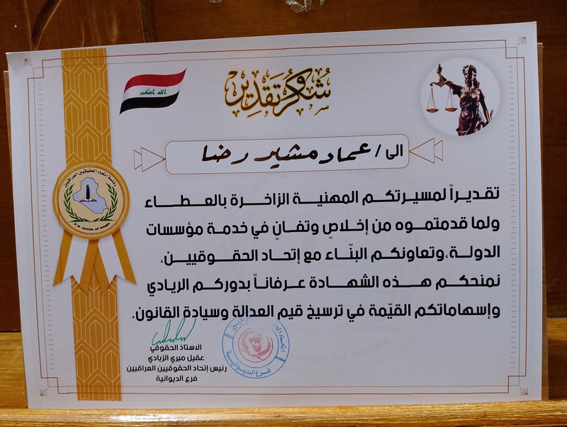 في أمسية رمضانية جميلة ..تم الاحتفال مساء أمس بهذا اليوم المبارك (يوم الحقوقي العراقي )حيث تم تكريم زميلكم وصديقكم (المستشار القانوني ..الحقوقي عماد الصگبان ) من قبل رئيس اتحاد الحقوقيين قدفرع الديوانية ..الأستاذ الحقوقي عقيل الزيادي رئيس الفرع ..للجهود المبذولة في مجال عملنا ..