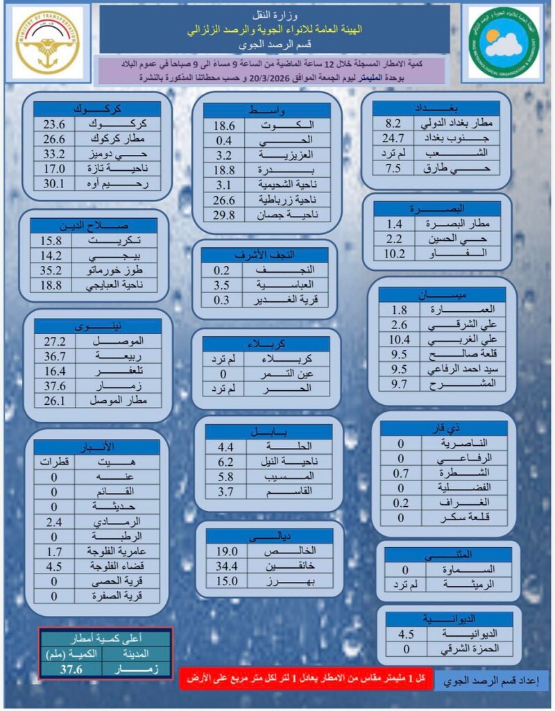 - نينوى (المتصدرة): كما ذكرت في طلبك، تصدرت محافظة نينوى القائمة، وسجلت منطقة زمار أعلى كمية أمطار في البلاد بواقع 37.6 ملم. هذا يشير إلى عبور قلب المنخفض فوق المناطق الحدودية الشمالية الغربية.