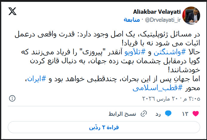 وتأتي تصريحات المستشار علي أكبر ولايتي، بينما يواصل كبار المسؤولين الأمريكيين والإسرائيليين في "إظهار الثقة في الحملة العسكرية"، حيث قال وزير الحرب الأامريكي بيت هيغسيث يوم أمس، إن "الولايات المتحدة تنتصر بشكل حاسم" موضحا أن "الدفاعات الجوية الإيرانية قد تم تسويتها بالكامل".