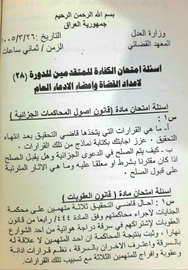 من أسئلة الكفاءة لطلبة المعهد القضائي