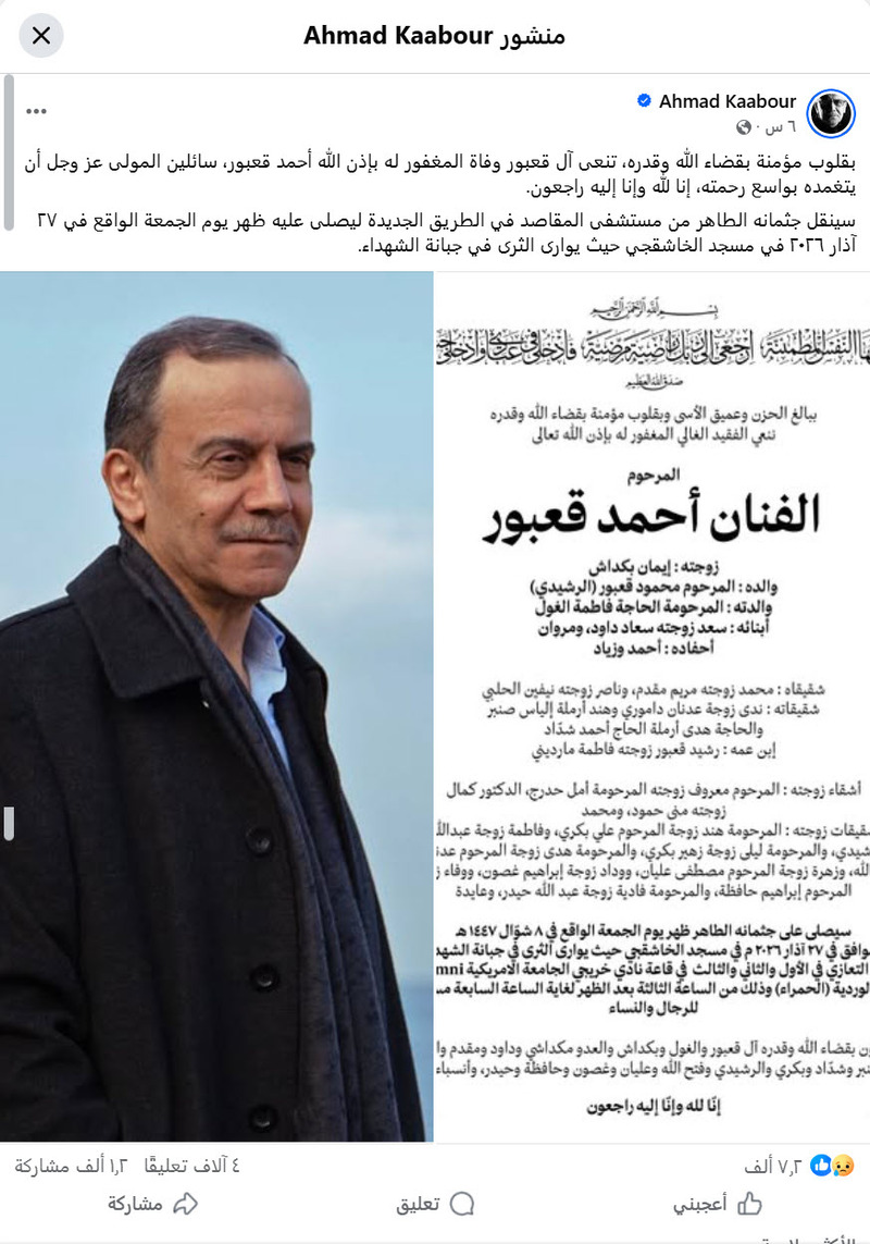 توفي مساء اليوم الخميس الفنان اللبناني أحمد قعبور، صاحب رائعة "أناديكم"، وأحد أبرز رموز الأغنية الملتزمة في لبنان والعالم العربي، عن عمر ناهز 71 عاما، بعد صراع مع مرض السرطان، ومسيرة فنية امتدت نحو خمسة عقود ارتبطت بفلسطين والإنسان وقضايا العدالة والحرية.