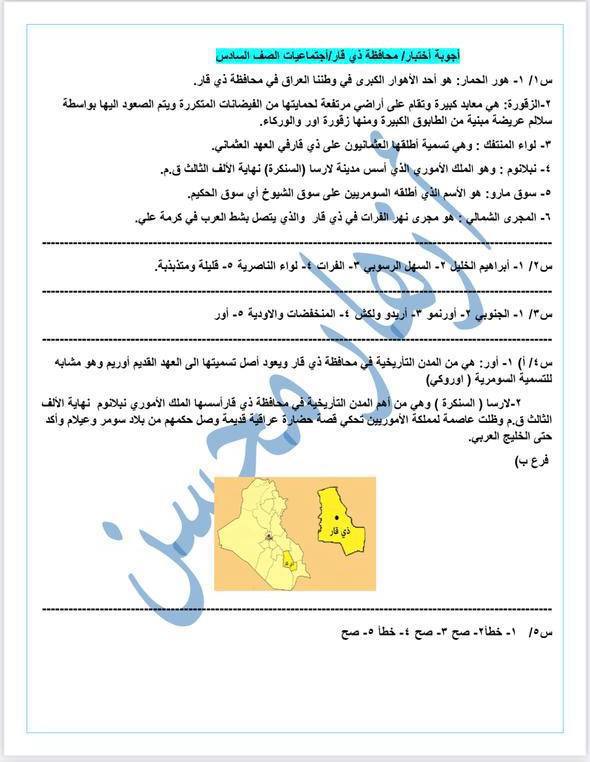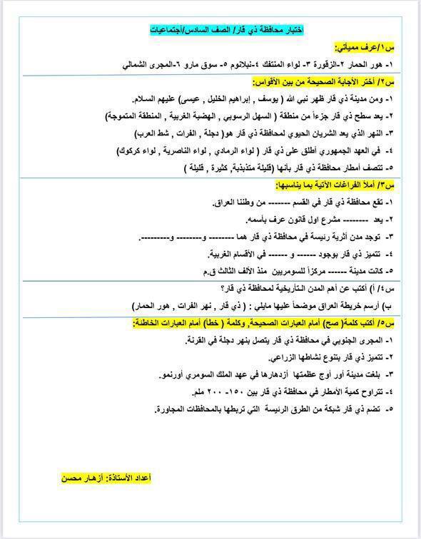 اسئلة عن محافظة ذي قار لمادة الاجتماعيات للصف السادس الابتدائي