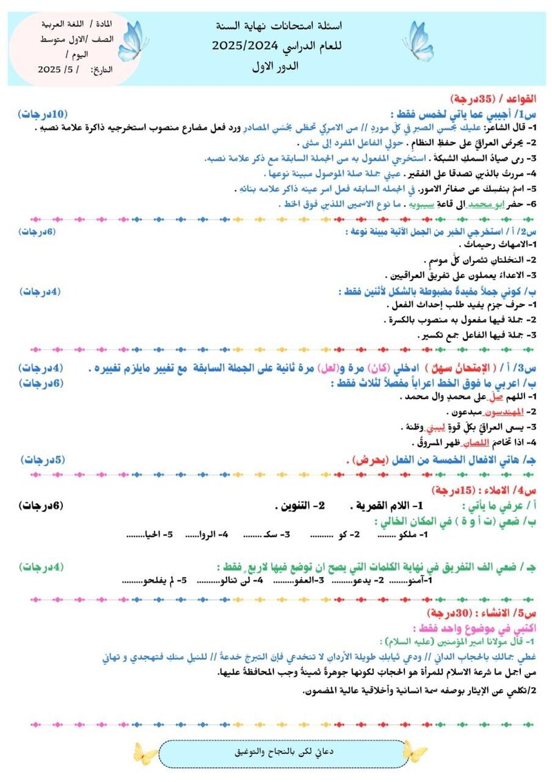 نموذج اسئلة عربي نهاية السنة للصف الاول متوسط