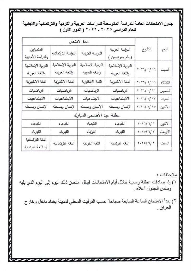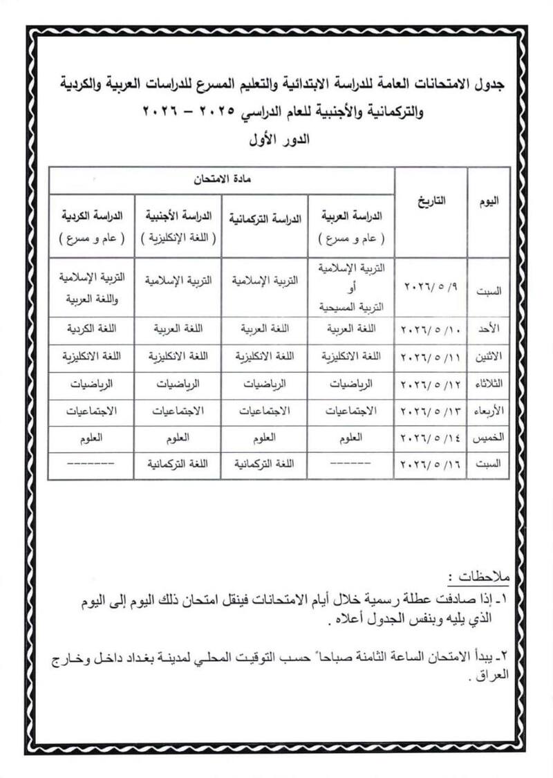 التربية تنشر جدول الامتحانات النهائية للمراحل الدراسية المنتهية 2025-2026 / الدور الاول