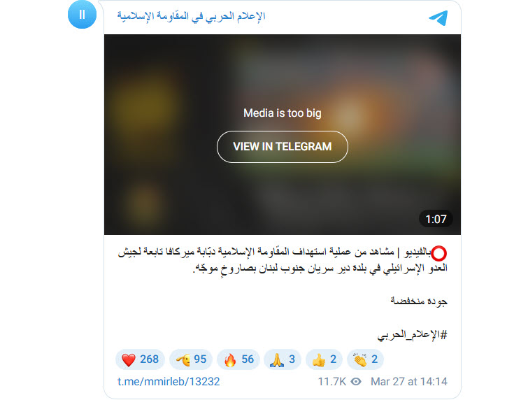 نشر "حزب الله" اليوم الجمعة مشاهد لاستهداف دبابة ميركافا إسرائيلية في بلدة دير سريان في جنوب لبنان بصاروخ موجه.