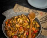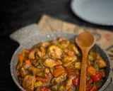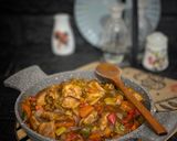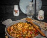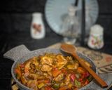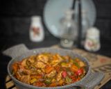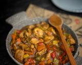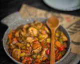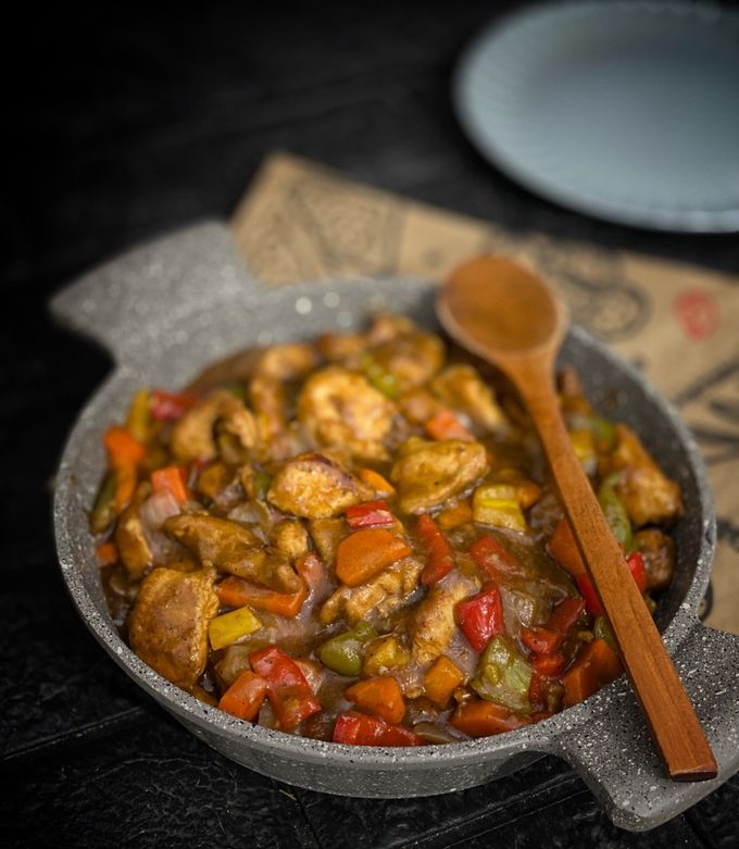 نقطع الجزر والفلفل الالوان مكعبات والبصل ثم نشوحها بالزيت ثم نضيف الكاتشب وصويا ورشة ملح وفلفل اسود ونقلبها جيدا ونضيف كأس ماء ونتركها تغلي ثم نضيف قطع الدجاج ونتركها ع نار متوسطه حتى تنضج قليلاً