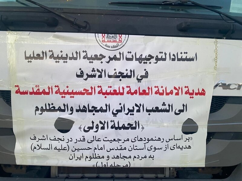 العتبة الحسينية، إغاثة الشعب الإيراني، نداء المرجعية العليا، السيد السيستاني، السيول في إيران، مساعدات طبية وإنسانية، كربلاء، النجف الأشرف، صور قافلة الإغاثة.