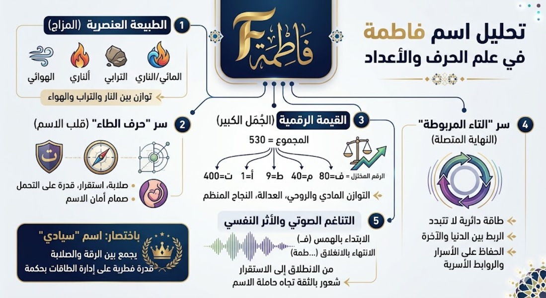 باختصار: اسم فاطمة في علم الحرف هو اسم "سيادي"؛ يجمع بين الرقة المتناهية والصلابة التي لا تُكسر، مع قدرة فطرية على إدارة الطاقات المحيطة بها بحكمة.
