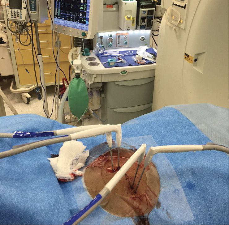 أثناء إجراء الاستئصال بالتبريد، يتم إدخال مسبار تبريد واحد أو أكثر في المنطقة المصابة بعد تخدير المريض أو تخديره الواعي. تُستخدم فحوصات التصوير بالموجات فوق الصوتية أو التصوير المقطعي المحوسب لتوجيه وضع المسبار والتأكد من تثبيت طرفه بشكل صحيح. بعد إدخال المسبار، يتم تدوير عامل التجميد داخله، مما يُكوّن كرة جليدية حول النسيج المستهدف. تُؤكد فحوصات التصوير المقطعي المحوسب أن الكرة الجليدية تُغطي الورم بالكامل بالإضافة إلى هامش من الأنسجة السليمة لضمان معالجة المنطقة بشكل كامل. بعد ذلك، يقوم نظام الاستئصال بالتبريد بتسخين المسبار وإخراجه من المريض بأمان.
