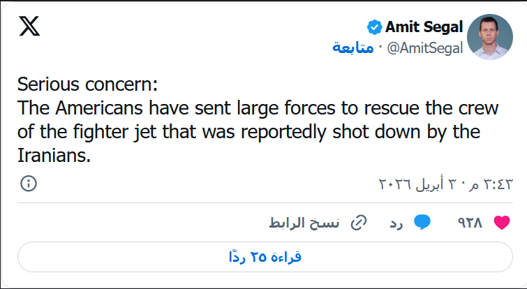 وذكر الصحفي الإسرائيلي أميت سيغال في القناة 12 العبرية أن الولايات المتحدة أرسلت قوات كبيرة لإنقاذ طاقم الطائرة المقاتلة التي أسقطها الإيرانيون.